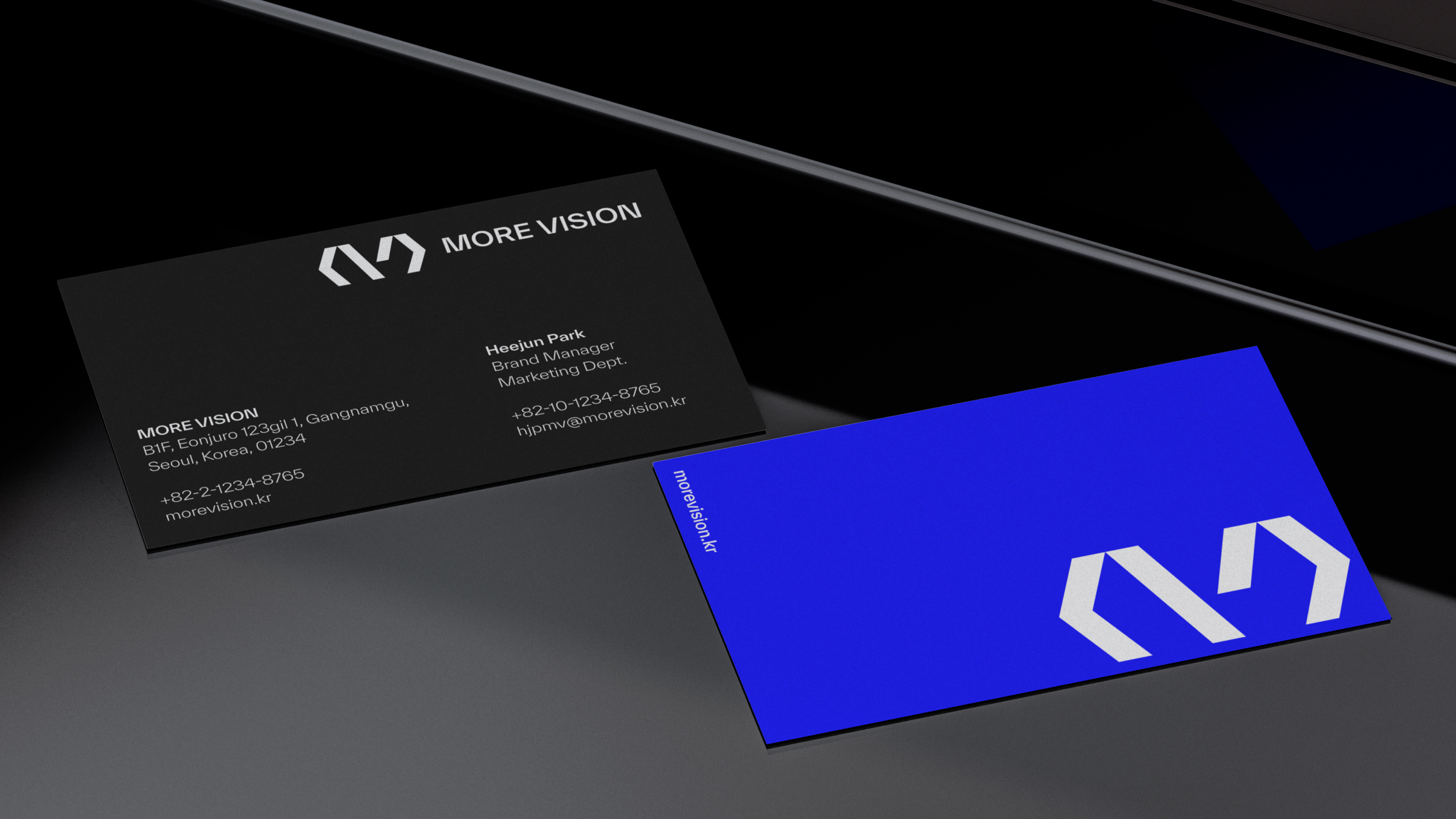 MoreVision 브랜드 마크의 핵심인 심볼 마크는 모노그램 형태로, 확장과 방향성을 의미하는 화살표 모양의 괄호 < >와 성장과 도약을 상징하는 두 개의 대각선을 결합하여 MoreVision의 이니셜인 M과 V를 형상화했습니다. 이렇게 대각선을 연결해 만든 심볼 마크는 좌우 대칭 구조를 이루며, 허브와 플랫폼의 이미지를 담고 있습니다. 또한 리드미컬한 곡선은 엔터테인먼트 브랜드로서의 활기찬 이미지를 전달합니다.