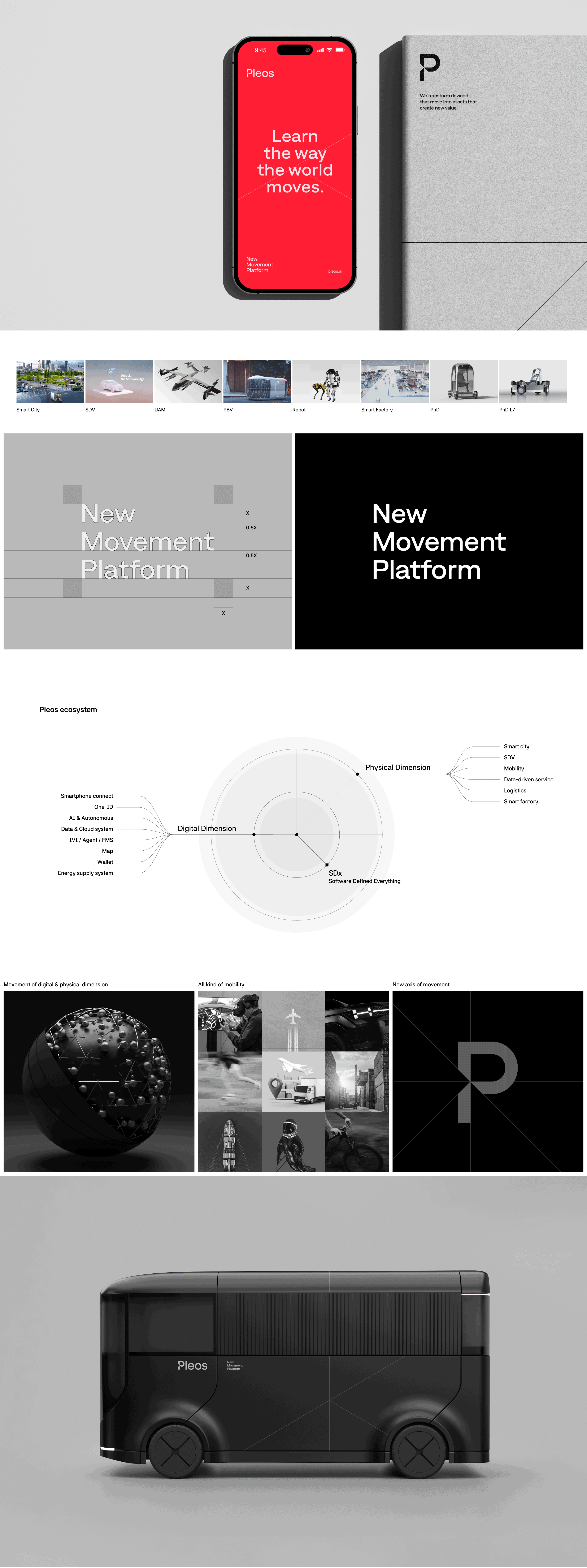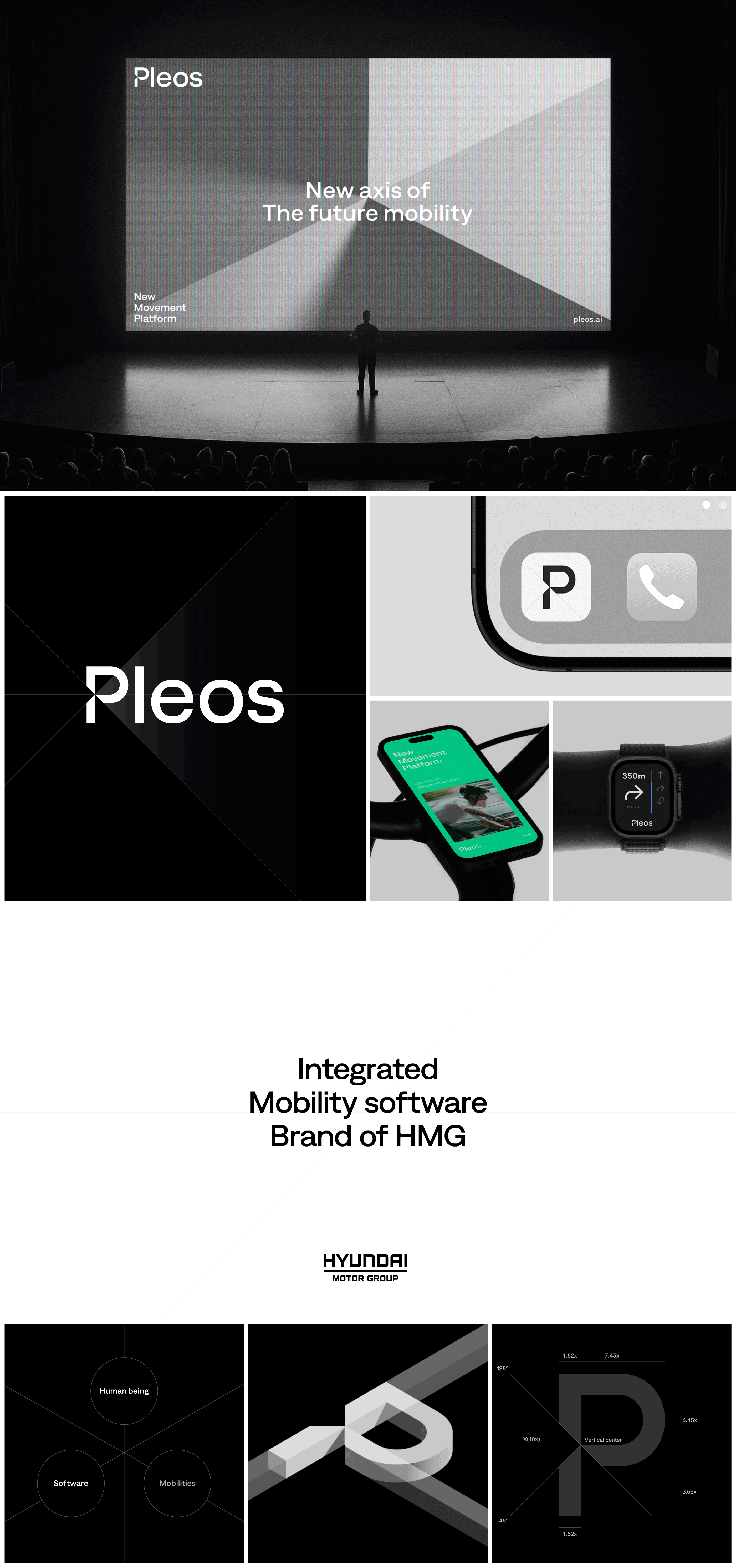 Pleos represents a vision of connecting Mobilities, Software, and Human into a unified ecosystem where freedom of movement is equally accessible to all. Its brandmark fuses X, Y, and Z axis movements into the initial P, symbolizing multidimensional connection and integration.The core design idea, New Axis, visualizes Pleos as a central platform for a new mobility ecosystem— open, evolving, and collaborative. By bridging digital and physical dimensions, and leveraging realtime movement data, Pleos advances the vision of Software Defined Everything (SDx) as Hyundai Motor Group’s integrated software brand.