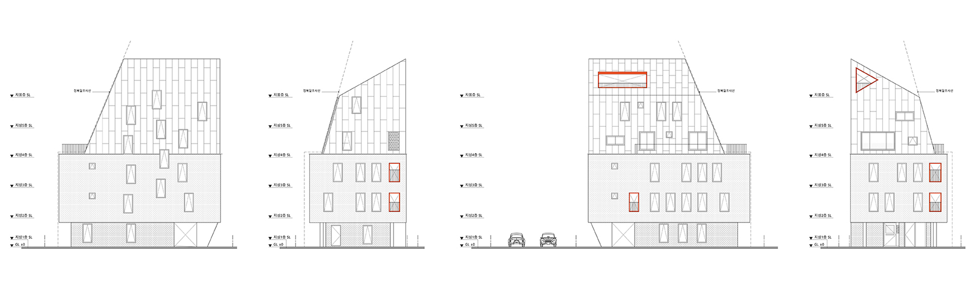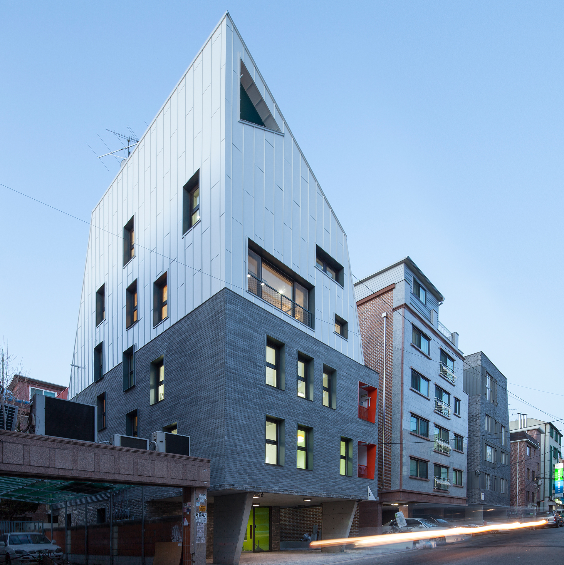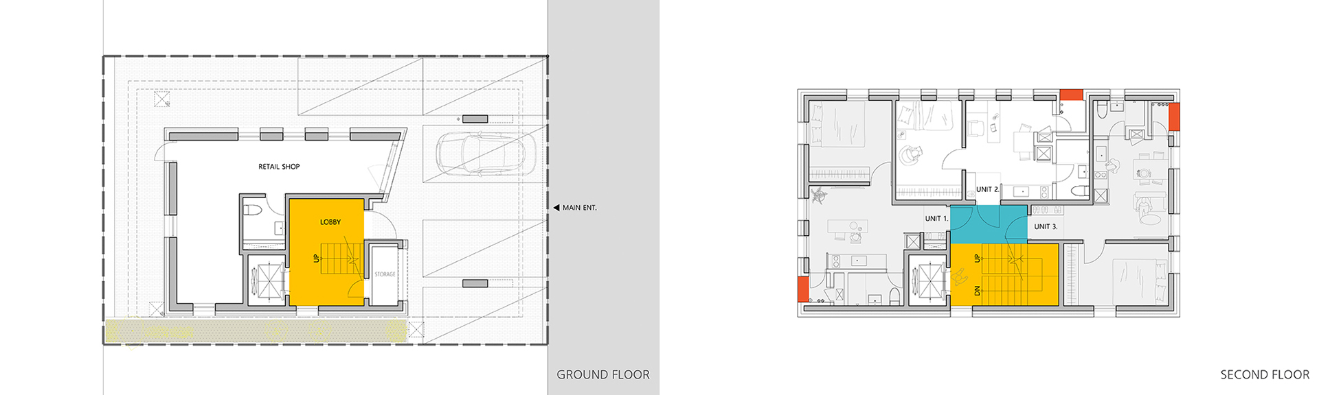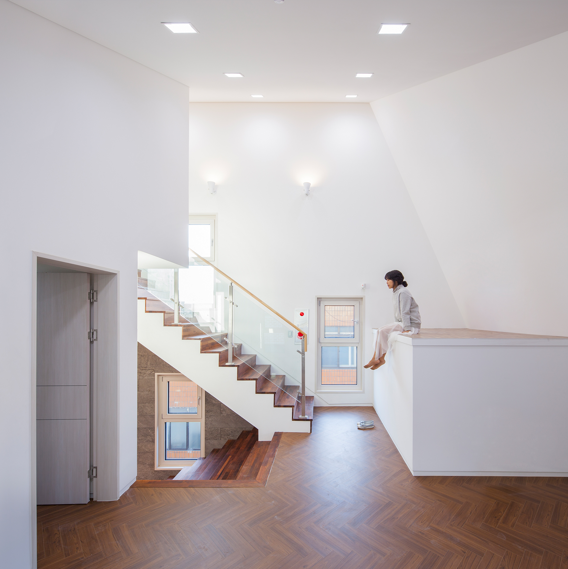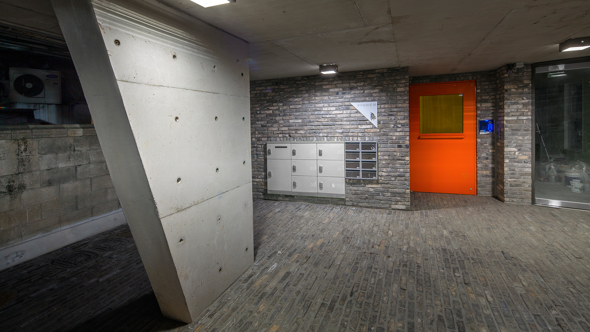 지상층의 근생공간은 변화하고 있는 가로(송이로)의 상업공간과의 연결을 고려하였습니다. 그리고 주거세대 정문과 근생공간 내부에 눈에 띄는 색을 배치함으로써 건물의 활기를 전달하고자 하였습니다. 이 건물의 내부계단은 층에 따라 다양한 색을 마주합니다. 사람들은 색에 따라 그들이 몇 층에 있는지 인지할 뿐 아니라, 로비, 복도, 계단 등의 공용공간에서 낯선 장면을 맞닥뜨리게 됩니다. 이 익숙치 않은 경험은 공용공간을 더욱 생경하게 만들어 유쾌한 기억을 만듭니다.