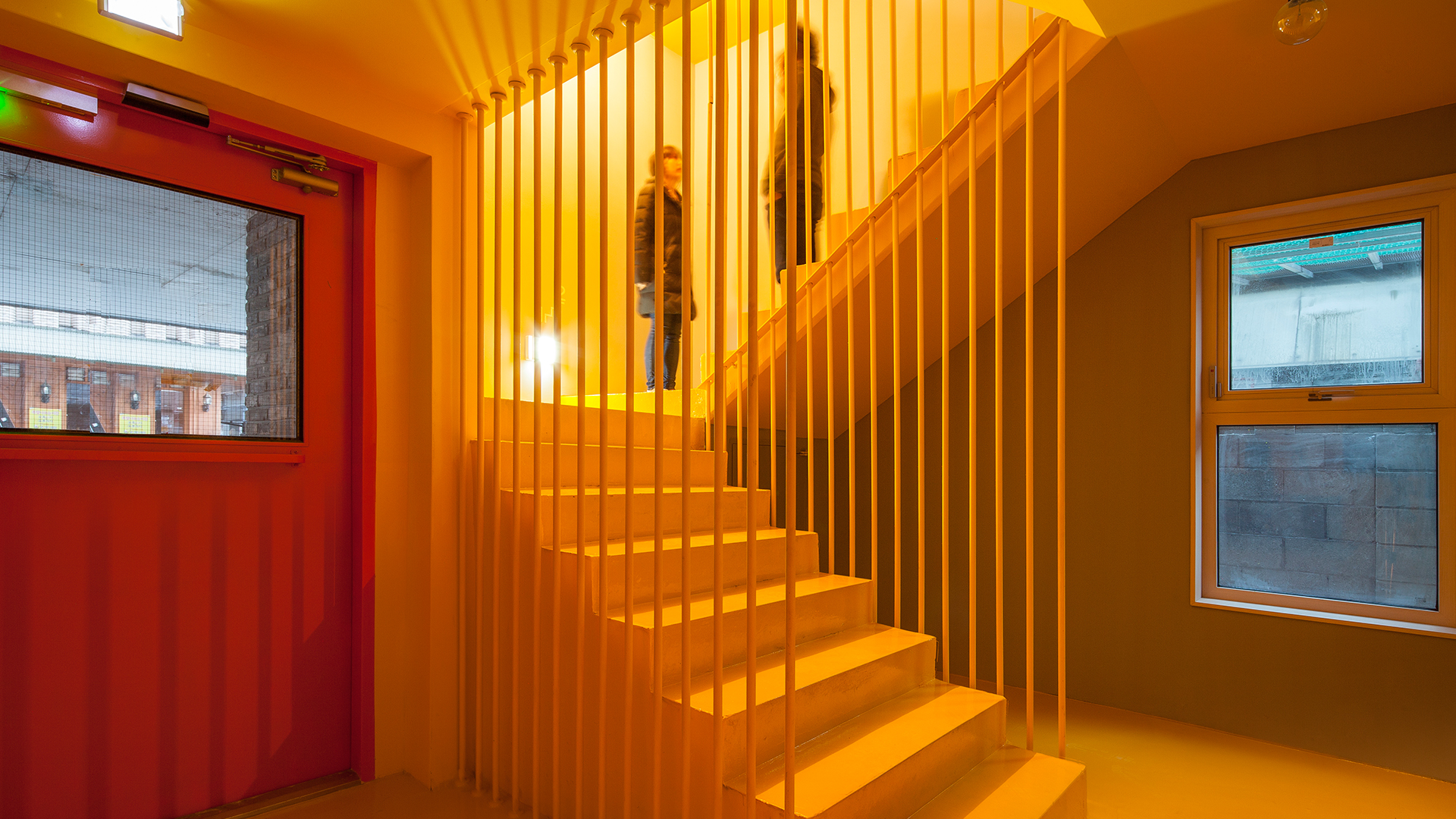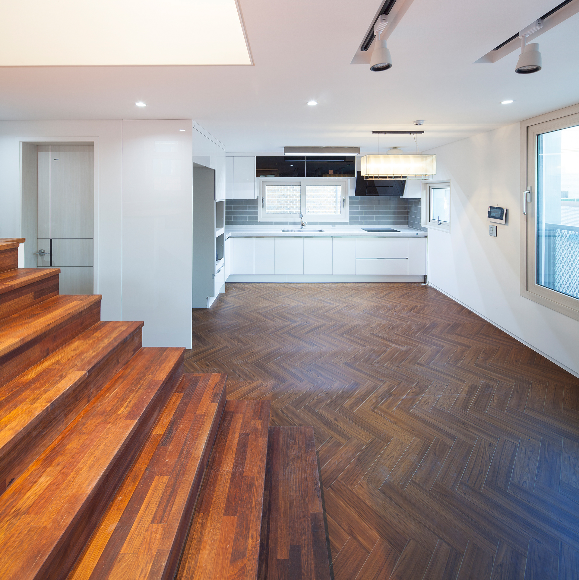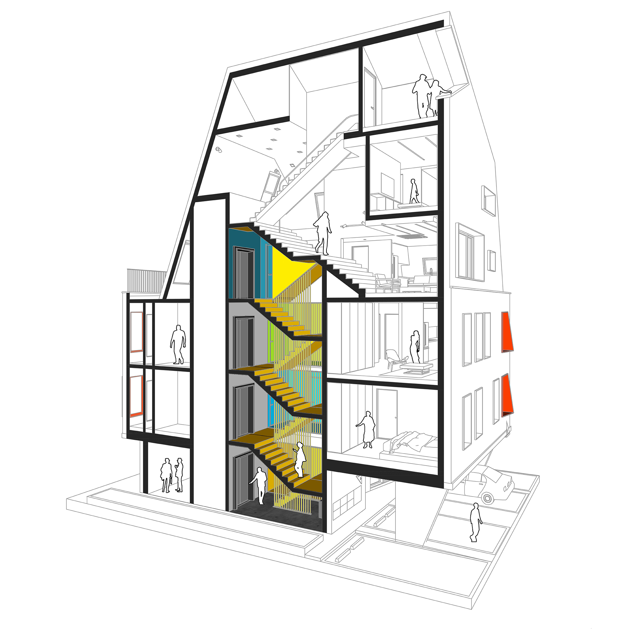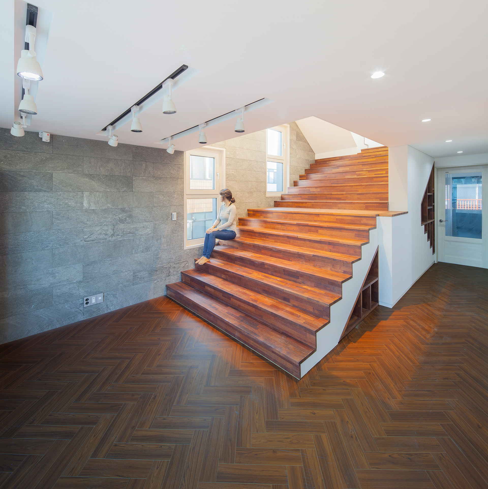 지상층의 근생공간은 변화하고 있는 가로(송이로)의 상업공간과의 연결을 고려하였습니다. 그리고 주거세대 정문과 근생공간 내부에 눈에 띄는 색을 배치함으로써 건물의 활기를 전달하고자 하였습니다. 이 건물의 내부계단은 층에 따라 다양한 색을 마주합니다. 사람들은 색에 따라 그들이 몇 층에 있는지 인지할 뿐 아니라, 로비, 복도, 계단 등의 공용공간에서 낯선 장면을 맞닥뜨리게 됩니다. 이 익숙치 않은 경험은 공용공간을 더욱 생경하게 만들어 유쾌한 기억을 만듭니다.