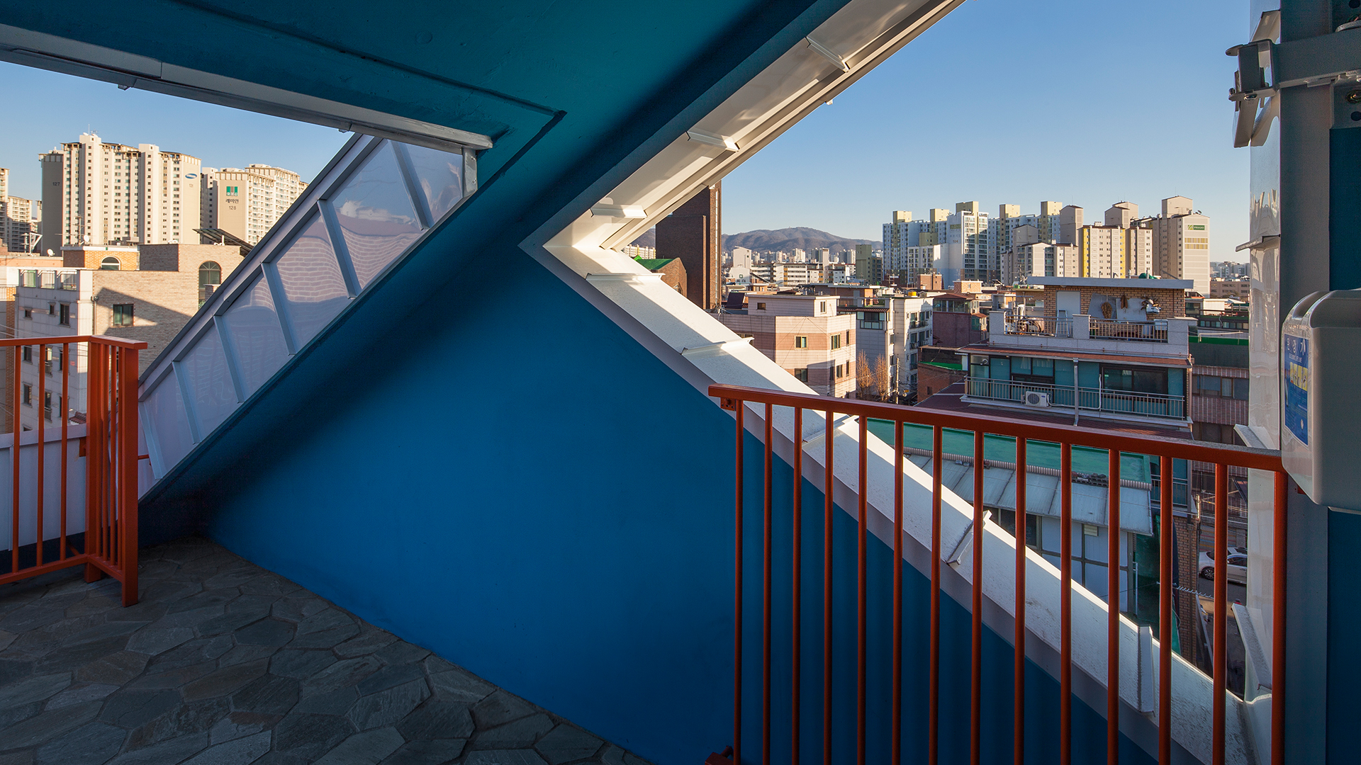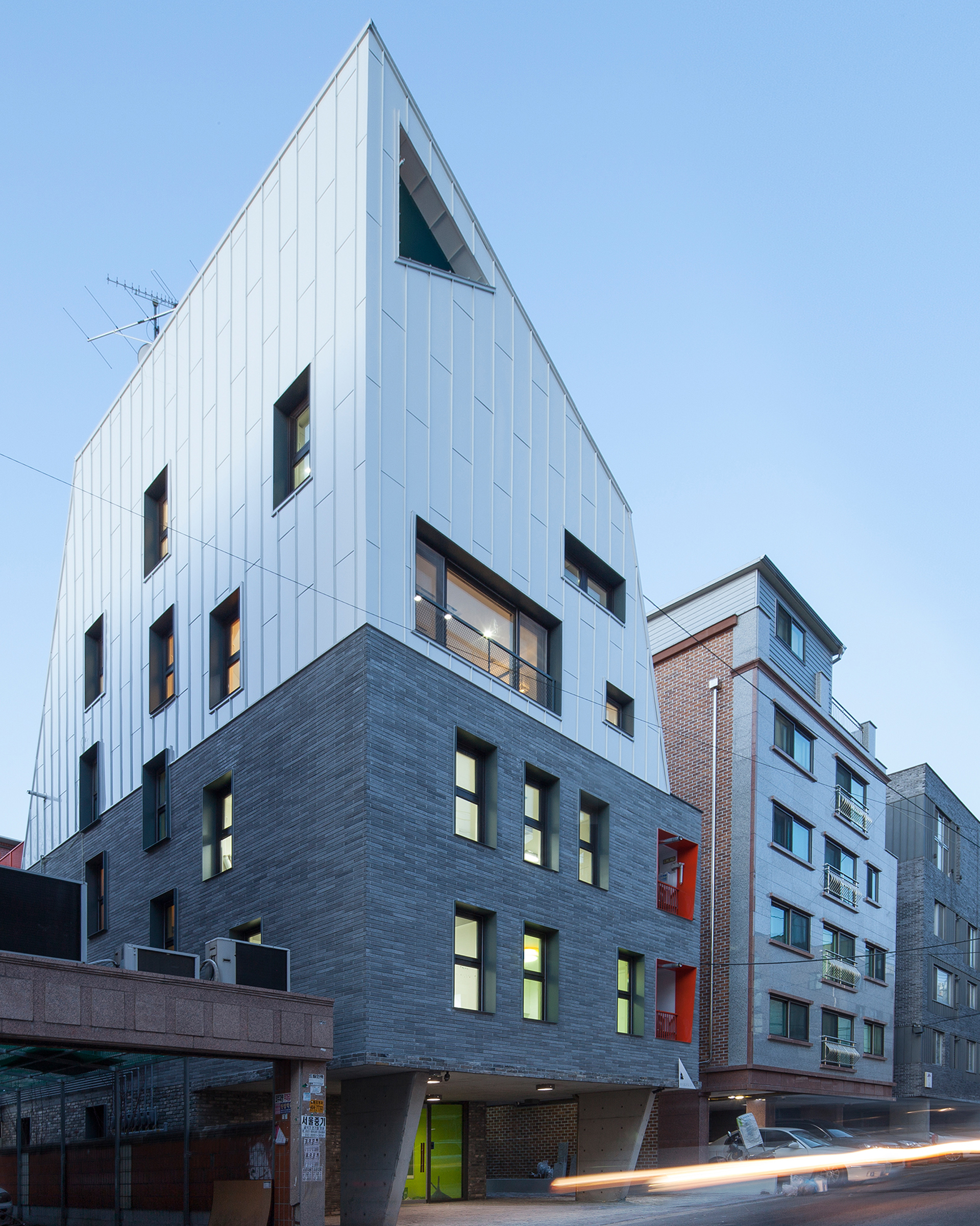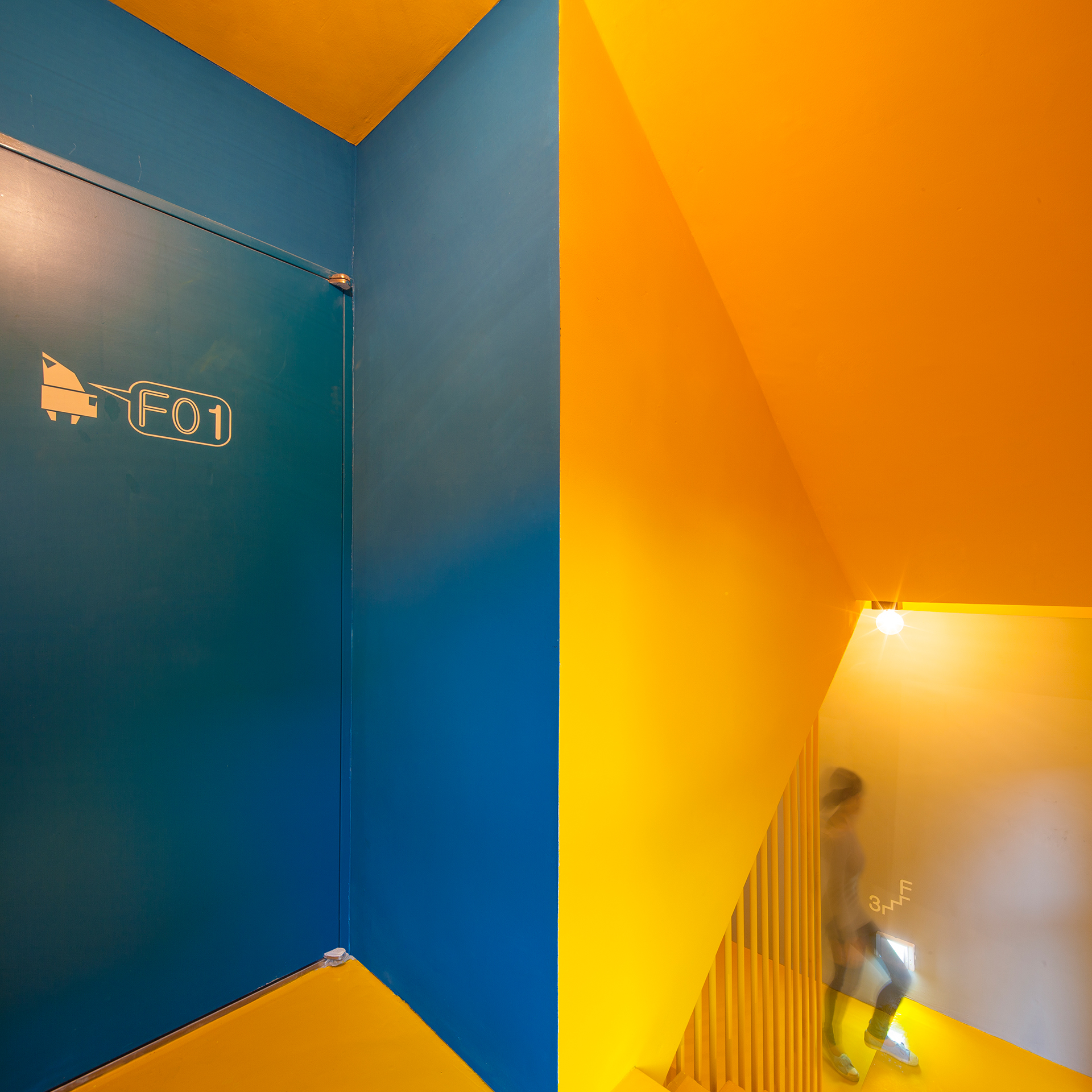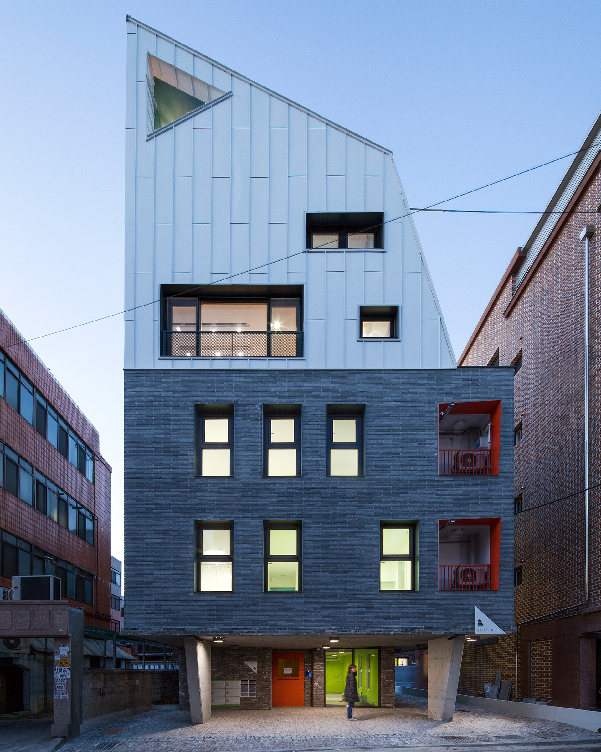 The pilotis and retail space are designed by considering active connection and expandability towards other retail places on the street. The main gate and interior space of the ground floor are colored with vivid colors – red and lime, which helps the building to deliver its attractiveness to its neighbors. The yellow staircase meets up with diverse colors according to the floor. People would not only recognize which floor they are on by the colors but also find unaccustomed scene in common space – lobby, hallway, and stairs. This unfamiliar experience allows core spaces to be more unexpected and enjoyable.