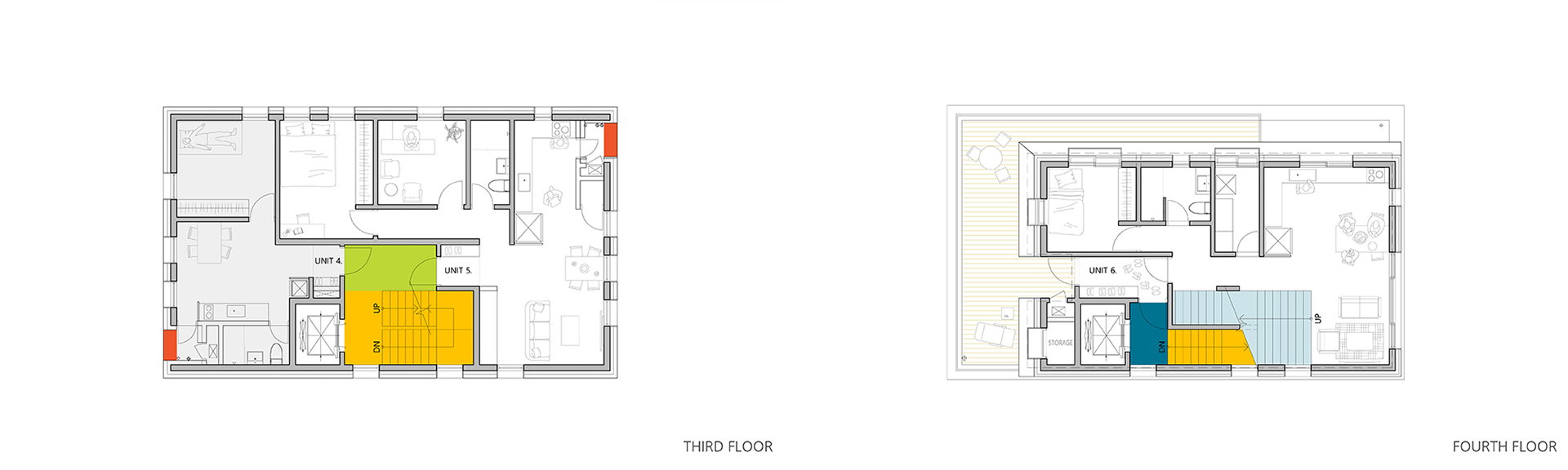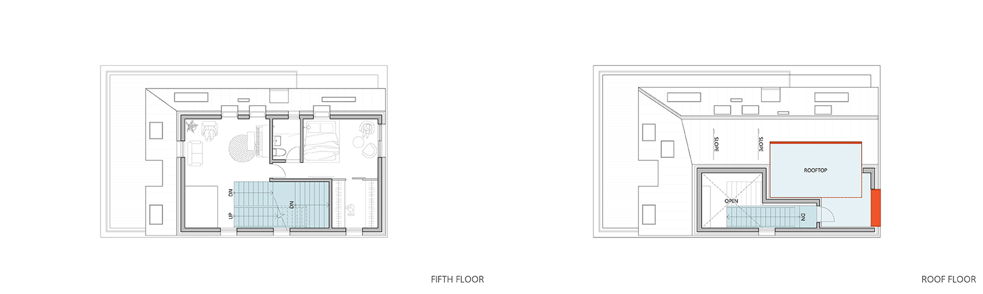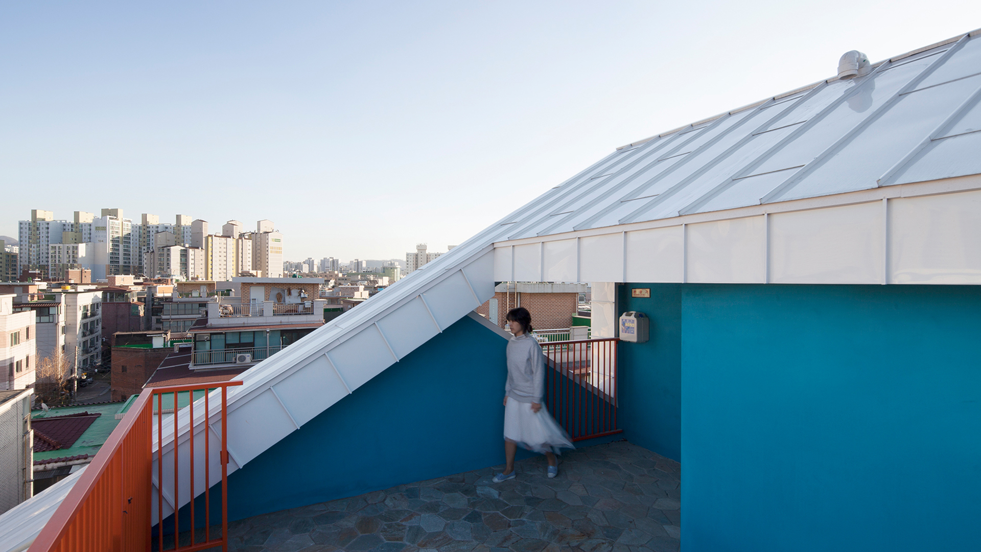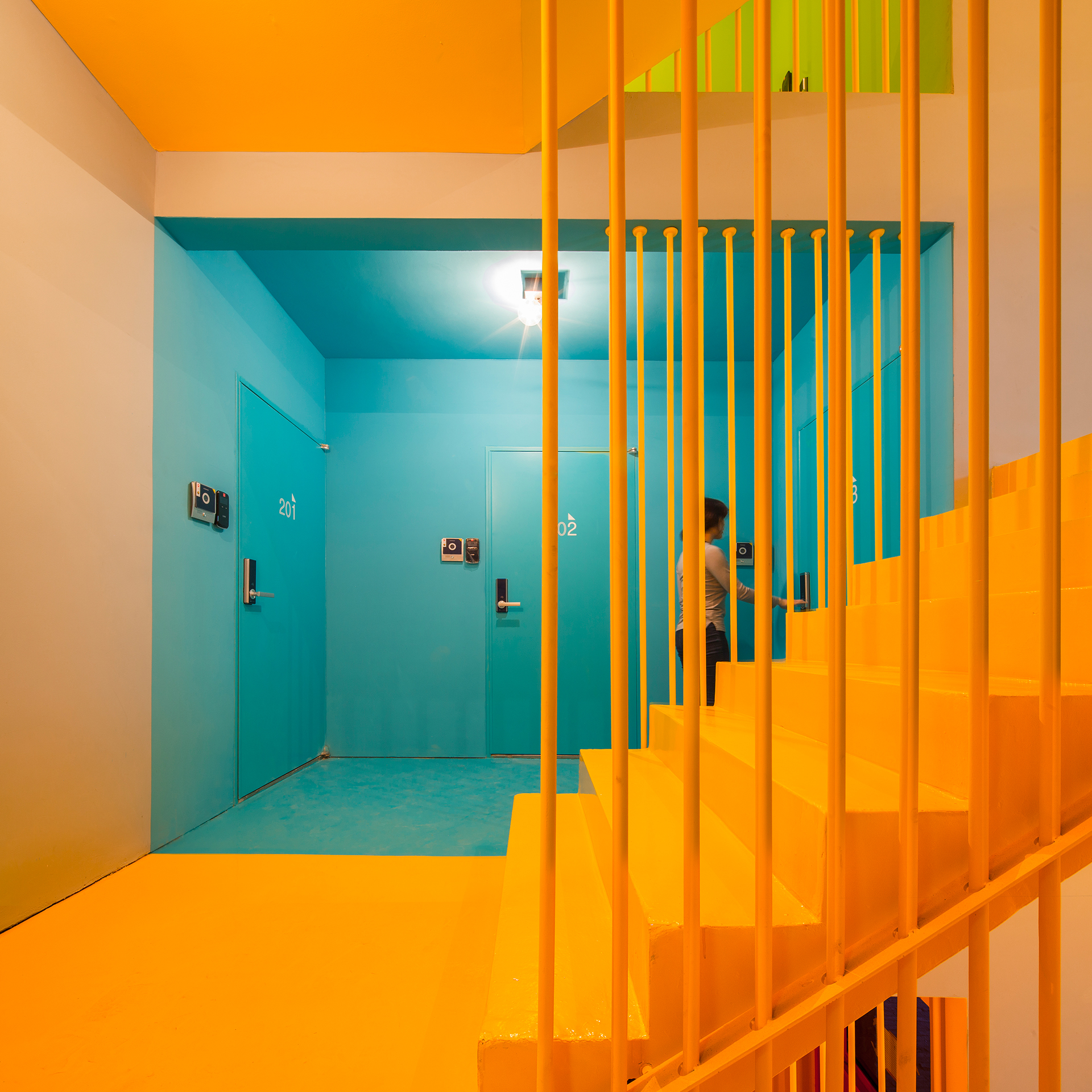 The pilotis and retail space are designed by considering active connection and expandability towards other retail places on the street. The main gate and interior space of the ground floor are colored with vivid colors – red and lime, which helps the building to deliver its attractiveness to its neighbors. The yellow staircase meets up with diverse colors according to the floor. People would not only recognize which floor they are on by the colors but also find unaccustomed scene in common space – lobby, hallway, and stairs. This unfamiliar experience allows core spaces to be more unexpected and enjoyable.